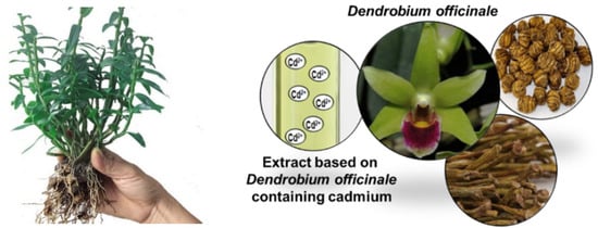 As for the transport of metal ions in plants, both apoplastic and symplastic pathways can be distinguished. Heavy metals using the apoplastic pathway can reach the apical region of the underdeveloped endodermal suberin lamellae []. The translocation and accumulation processes are closely related to the mobilization, radial transport [], and long-distance transport in xylem, as well as sequestration and detoxification of metal ions []. Radial translocation, in particular, is essential for the accumulation of heavy metals in the above-ground organs. For example, Pb(II) in the epidermal and cortical cells of the roots cannot be loaded to the steles, which leads to a large accumulation in the roots that cannot be further transported to the shoots driven by the transpiration stream [,]. Similarly, this effect was observed in Cr-tolerant plants. The Cr absorbed by Typha angustifolia is mainly distributed in the outer layer of the roots, while only a minor portion of Cr is transferred to fronds and distributed uniformly []. The method of transport and place where heavy metal ions accumulate (roots, leaves, steams, blossoms) play a significant role when considering the part of the plant from which the extract is obtained, especially in traditional herbal medicine (THM). These aspects are presented based on the Dendrobium officinale Kimura et Migo used in this study (Figure 3). D. officinale is a famous Chinese plant used in traditional Chinese medicine (TCM). Its extracts contain various phytochemicals, particularly polysaccharides, that have nutraceutical and pharmaceutical value. They are commonly used to reduce blood lipids, promote blood circulation, and improve body immunity. They are also very important during radiotherapy and chemotherapy to reduce the induced side effects (enhance suppression and resistance to free radical damage), improve quality of life, and survival time during cancer treatment.