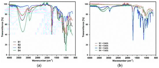 ATR-FTIR spectra of S1-S4, (a) before and (b) after the sorption process of Cd(II).