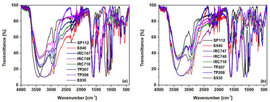 ATR-FTIR spectra of SP112, S940, IRC 747, IRC748, IRC718, TP207, TP208, and S930 (a) before and (b) after the sorption process of Cd(II).
