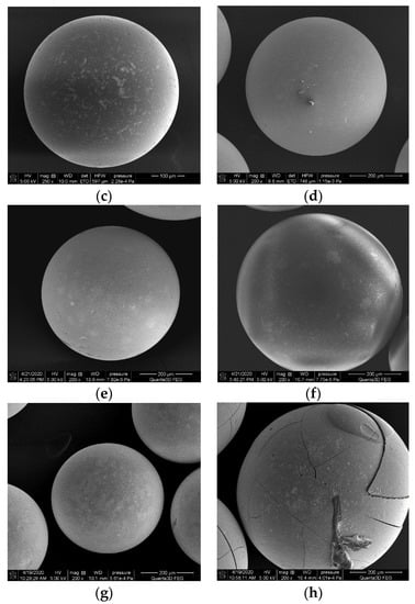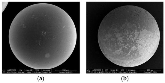 SEM analysis of the materials revealed that, as mentioned in the table presenting the physicochemical properties, ion exchangers differ in bead size (presented images are in the same magnification). Their surface is typical of macroporous materials (Figure 7). Analogous results were presented in [,,].