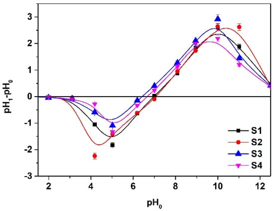 The pH of zero charge (pHpzc) of S1–S4 sorbents was determined using the solid addition method. The solutions of 0.01 M KNO3 concentration of proper pH, which was in the range from 1 to 12, were prepared using 0.1 M HCl and 0.1 M NaOH. Then 0.2 g of sorbent was brought into contact with 20 cm3 of solution for 24 h (vibration amplitude 8 units, shaking speed 180 rpm). After this period of time, the pH of the solution was measured again (pH1) using a pH-meter CP-411 (Elmetron, Zabrze, Poland). The plot pH0 vs. pH1-pH0 was obtained and is presented in Figure 8. The values of the point of zero charge were equal to 6.42 (S3), 6.66 (S4), 7.04 (S1), and 7.05 (S2).
