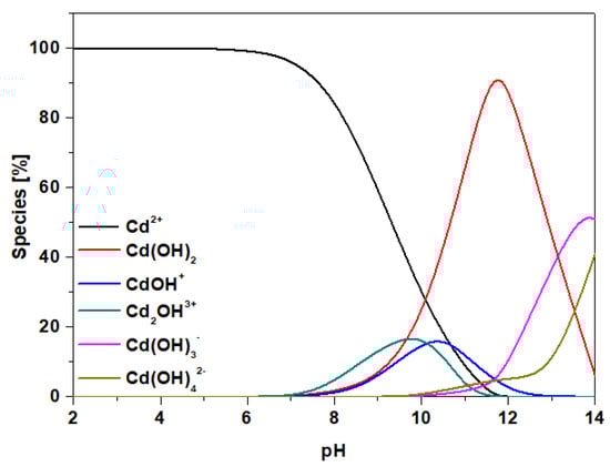 Due to the surface properties of adsorbents, one of the factors that is taken into account when assessing their adsorption capacity is pH. Its influence is related to both the effect on the chemical behavior of the adsorbent, as well as the adsorbate, i.e., the species present in the solutions at different pH values and the nature of the structures formed between the adsorbate and the adsorbent. According to literature data on the speciation of cadmium ions, the following forms were found to be the dominant species: Cd2+ and Cd(OH)+ at pH <8 and Cd(OH)2 at pH >8 at the initial concentration 100 mg/dm3 (Figure 9) [].