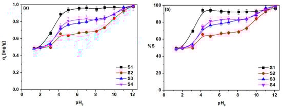 Influence of solution pH on Cd(II) sorption on S1–S4 (a) qt and (b) %S (c0 = 10 mg/dm3 Cd(II), A = 8, 180 rpm, 293 K, m = 0.2 g, V = 20cm3, t = 4 h).