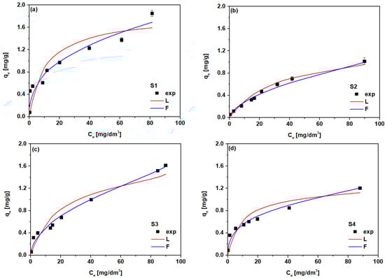 To describe the interactions between the Cd(II) ions and the above mentioned adsorbents, the most popular adsorption isotherms were applied to fit the experimental data to the Freundlich and Langmuir models. The Freundlich and Langmuir isotherm parameters were calculated from the linearized plots of log qe vs. log Ce and Ce/qe vs. Ce, respectively. Moreover, the obtained results were described using the 1/n parameter and the separation factor RL (Table S3). The Freundlich model is based on a different approach, it does not predict surface saturation and considers the existence of a multilayered structure. The Langmuir isotherm model predicts the formation of an adsorbate monolayer on the homogeneous adsorbent surface, with no side interactions between the adsorbed ions. The calculated isotherm parameters for the Cd(II) on S1–S4 are presented in Table 6.