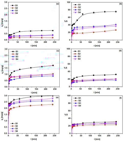 The time-dependent behavior of Cd(II) sorption with S1–S4 was investigated in the range from 1 min to 4 h, and the amount of Cd(II) adsorbed (qt) on S1–S4 as well as the sorption percent (%S) were calculated. The plots qt vs. t are presented in Figure 12a,c,e. The plots %S vs. t are presented in Figure 12b,d,f. Additional curves are presented in Figure S2 (Supplementary Materials).