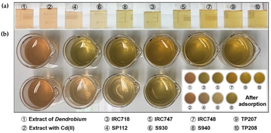 The effects of phase contact time on the Cd(II) adsorption from D. officinale extracts containing 10, 25, and 50 mg/dm3 of Cd(II) and %S were also analyzed for chelating ion exchangers SP112, S940, IRC 718, IRC 747, IRC 748, TP207, TP 208, and S930. The kinetic curves were plotted as qt vs. t and %S vs. t. The exemplary results are presented in Table S4 (Supplementary Materials). Additionally, the D. officinale extracts before and after adsorption the ion exchangers are presented in Figure 13.