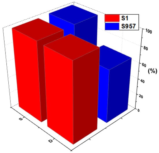 In the next step, desorption studies were also carried out using hydrochloric acid as eluent. Elution involves removing the Cd(II) from the used materials by reversing the adsorption process. The main factor that makes desorption a simple process is the fact that cadmium will only adsorb onto the surface of TPS-based materials. Other requirements of the elution process are high HCl concentration, low ionic strength of solution, optimum flow rate/speed of mixing, and low cadmium concentration in the solution. A comparison of Cd(II) elution efficiency using 1 M HCl from the best S1 sorbent and ion exchanger S957 is presented in Figure 14. In the case of 1 M HCl, the desorption was almost completed (100%) for S1 sorbent; however, in the case of S957 it was equal to 67%. In the case of the low-cost adsorbents (like S1–S4), their rare reuse was taken into account, due to the fact that the amount of the cadmium(II) adsorbed is not high. Therefore, disposal of the exhausted adsorbent is proposed. The obtained results also suggest the different mechanisms of sorption: for the TPS based sorbent, physical adsorption, and for IXs, chemical reaction.