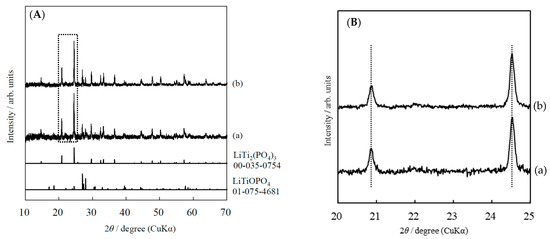 Figure 2A shows the XRD patterns of LATP sheets calcined at 650 °C and CSP-LATP sheets. In the XRD patterns of both sheets, the main peak attributed to the pattern of LiTi2(PO4)3 (JCPDS 00-035-0754) was detected, but the peak attributed to the impurity phase, LiTiOPO4 (JCPDS 01-075-04681), was also detected. To avoid Li volatilization during high temperature sintering, the sintering time was shorter than those reported in others [7,8,9]. As a result, an intermediate product phase, LiTiOPO4, was observed in the sheets of porous LATP. As shown in Figure 2B, The shift of diffraction peaks of the LATP sheet was not observed by CSP treatment. This indicates that no reaction, such as decomposition or ion exchange reaction, occurred between the LATP and the water added during the CSP.