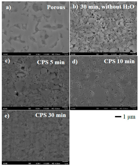 Additionally, cracks due to pressurization during CSP were observed in the coarse particles. On the other hand, the microstructure of the LATP sheets (Figure 3c–e) prepared by CSP was different from that of the porous sheet (Figure 3a). In the cross-section of the cold-sintered LATP sheets in Figure 3c–e, particles with sizes less than 1 μm that were crushed during CSP filled the pores between the larger particles. Although the sintering necks could not be observed at the grain boundaries in the cold-sintered LATP without H2O (Figure 3b), it was observed that fine particles were bonded to one another in LATP with 30 wt% H2O (Figure 3c–e). This indicates that the uniformed addition of water to the porous LATP electrolyte sheets promoted densification during the CSP, resulting in formation of necks between the grains. Despite a CSP time of only 5 min, a noticeable number of fine particles have already precipitated to fill the LATP sheet’s pores. With increasing CSP time, the amount of the precipitated fine particles increased, and the pores in the LATP sheets were almost filled after 30 min of CSP, as shown in Figure 3e. This led us to conclude that the porosity of the LATP sheets can be reduced with increasing CSP time.