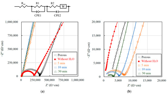To investigate the effects the added water and CSP time have on the conductivity of the LATP sheet, the conductivity measurement was performed Figure 4 shows the Nyquist plots of the porous and cold-sintered LATP sheets at room temperature. In each of the Nyquist plots of all five samples, one semicircle on the high-frequency side and a tail attributed to electrode diffusion on the low-frequency side were observed. In general, in the Nyquist plot of an electrolyte, two semicircles attributed to bulk resistance and grain boundary resistance can be observed on the high and low-frequency sides, respectively. In the present work, the semicircle in Figure 4 was attributed to the total resistance, the sum of the bulk and grain boundary resistance, since the constituent resistances could not be separated. The data were fitted with a series of two parallel combinations of R, CPE, and W circuits, where R corresponds to an ohmic resistor, CPE to a constant-phase element and W represents Warburg impedance. An additional resistance element (with resistance Rint) in series was also included to account for inductive effects, resulting in the deformation of the high frequency semicircle. The values of the total conductivity of the porous LATP and the cold-sintered LATP without H2O were, calculated from the resistances of the high frequency equivalent circuits, 3.0 × 10−6 S/cm and 4.4 × 10−6 S/cm at 25 °C, respectively. The total conductivity of the porous LATP sheet is lower than that of the conventionally sintered LATP (10−4 S/cm) [7]. We attributed this reduction in conductivity to the presence of pores in the electrolyte sheet due to a lower sintering temperature, which was observed in the cross-sectional morphology analysis in Figure 3a. The conductivity of the cold-sintered LATP without H2O is slightly improved compared to that of the porous LATP sheet. We attributed this reduction in the total resistance to the decrease in grain-boundary resistance due to the pores being filled by pressurization during CSP. On the other hand, the total conductivities of the LATP sheets prepared by CSP for 5, 10, and 30 min were calculated from the resistances of the high frequency equivalent circuits, 1.4 × 10−4, 1.8 × 10−4, 3.0 × 10−4 S/cm at 25 °C, respectively. The total resistance of the LATP sheet significantly decreases after CSP with the addition of water and continues to gradually decrease with increasing CSP time. We considered that the grain-boundary resistance decreased due to improved interfacial bonding between the particles with increasing CSP time. Figure 5 shows the conductivity of the LATP sheets and the temperature of the stainless-steel mold against CSP time (min). The stainless-steel mold rose to the target temperature of 200 °C after 5 min, which corresponds to the sharp increase in the conductivity of the LATP sheets after CSP. Therefore, we confirmed that this increase in conductivity resulted from the rapid densification of the LATP sheets after the mold and the sample reached 200 °C.