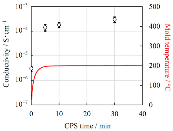 Conductivity of LATP sheets at 25 °C obtained from impedance measurements and mold temperature as functions of CSP time.