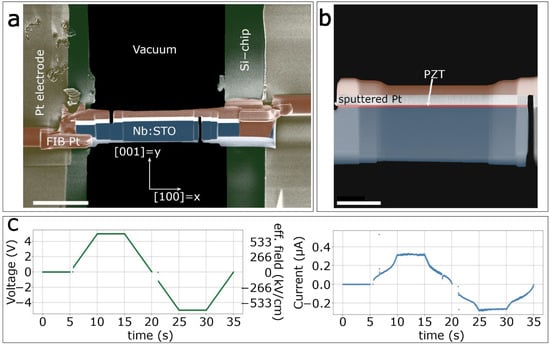 (a) False colored scanning electron microscopy (SEM) image and (b) false colored high-angle annular dark-field scanning transmission electron microscopy (HAADF-STEM) image of a lamella for in situ biasing prepared by focused ion beam (FIB). Yellow: Pt electrodes of the microelectromechanical systems (MEMS) chip. Orange: FIB-deposited Pt. Green: Si-MEMS chip, Blue: Nb-doped SrTiO3 (Nb:STO) substrate. Red: Pb(Zr0.2Ti0.8)O3 (PZT) thin film. The scale bars are 5 µm and 2 µm, respectively. (c) Applied voltage and measured current profiles during the in situ biasing experiments.