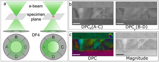 (a) Schematic representation of the basic principle of differential phase contrast (DPC)-STEM imaging. (Left) Electrons passing through vacuum. (Right) The electron beam is deflected by an electric field represented by the red ar-row. (b) Differential signals between two opposing detector segments (A − C, B − D). (c) Vector map of the DPC signal (left) and magnitude of the DPC signal (right). The scale bars are 50 nm.