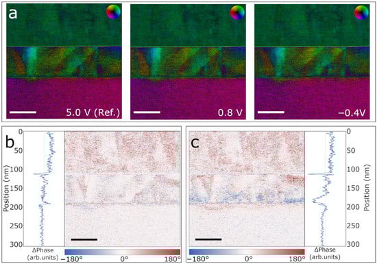 Following this process in the DPC signal is very challenging as minor sample misalignments result in significant color changes, as previously pointed out and shown in Figure 2c. The three DPC images shown in Figure 4a exemplify the difficulty of observing the dynamic changes during the biasing experiment from individual frames shown side-by-side. A way to overcome this problem is to track the evolution of the switching front by calculating the difference between two images acquired at different moments of the biasing experiment. In Figure 4, we describe this procedure by taking three DPC images acquired during the negative switching. In particular, as shown in Figure 4a, we use the DPC signals at 5.0 V (here the switching front is completely pushed down to the bottom interface and the film is fully upwards polarized), 0.8 V (the front has not yet started moving towards the top interface) and −0.4 V (the front is located roughly at the middle of the PZT film). The signal acquired at 5.0 V (initial state) is used as reference. The obtained difference images are shown in Figure 4b (as the difference in phase between 5.0 V and 0.8 V) and Figure 4c (difference between 5.0 V and −0.4 V). The blue color in the difference maps relates to a phase change of up to −180° and the red color of up to +180°, while the line profiles on the side are obtained by averaging the phase change along the horizontal direction. Of particular interest in these results is the blue front that has clearly developed from the Nb:STO/PZT interface in Figure 4c and is not yet present in Figure 4b. A negative phase change at the 180 nm mark in the line profile shown in Figure 4c, not observed in Figure 4b, further illustrates this difference.