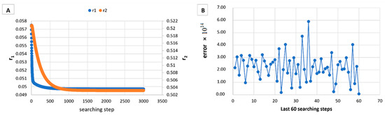 Evolution of reactivity ratio searching (A) and error for last 60 searching steps (B) with GD method for r1 = 0.05, r2 = 0.5 and Pn ∊ (30–55%).