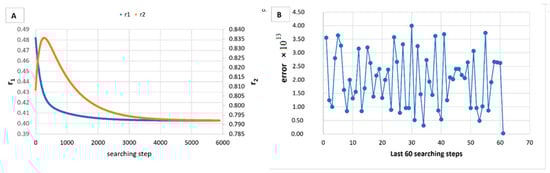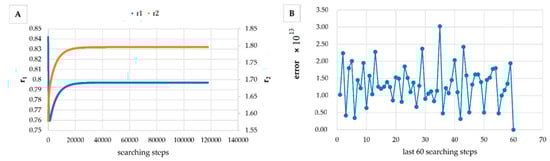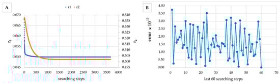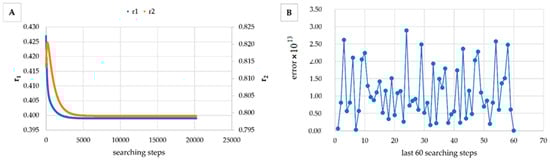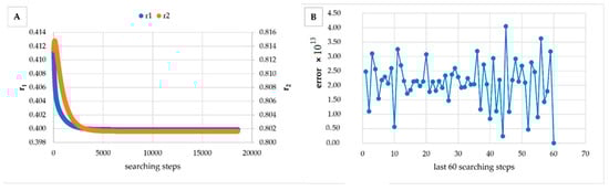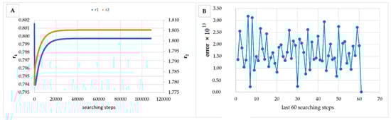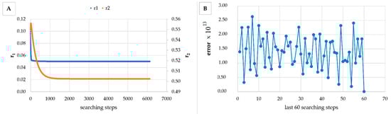 However, in Table 5, Table 6, Table 7, Table 8, Table 9, Table 10, Table 11, Table 12 and Table 13 it can be easily seen that in all cases, the integral method GD has the lowest bias compared to the initial conditions imposed, as well as the lowest values of the Fisher criterion. The e-KT method gives good results, with one exception at high conversion for values of r1 = 0.05, r2 = 0.5. The reason why by the e-KT method for the reactivity ratios r1 = 0.05, r2 = 0.5 at high conversions gives wrong values is due to the limitations of the method. This method can be used successful up to 40% conversions as well as to the errors of the logarithm function of around of 0 values. More details have been described by Tudos et al. []. The EVM method proposed by Chee and Ng [] is usable, with good results in a few cases. The limitation of the EVM variant proposed by Chee and Ng [] is due to the mathematical model used, because when one of the reactivity ratios is very close to zero and the conversion is high, the factor of logarithm can take negative values; for this reason, the results are erroneous. In Figure 1, Figure 2, Figure 3, Figure 4, Figure 5, Figure 6, Figure 7, Figure 8 and Figure 9, the evolution of reactivity ratios values is depicted, with searching steps and error value (Equation (39)) evolution for last 60 searching steps for the GD method for data given in Table 5, Table 6, Table 7, Table 8, Table 9, Table 10, Table 11, Table 12 and Table 13.
