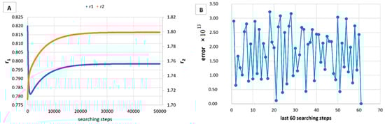 Evolution of reactivity ratio searching (A) and error for last 60 searching steps (B) with GD method for r1 = 0.4, r2 = 0.8 and Pn ∊ (30–55%).