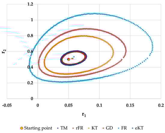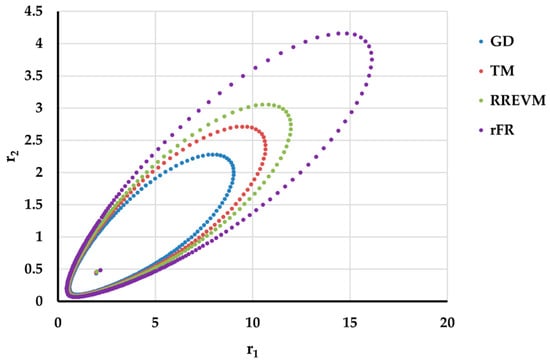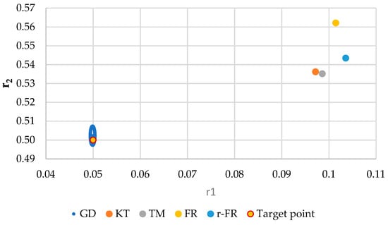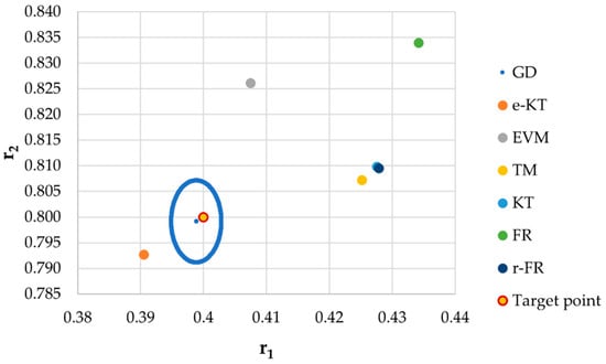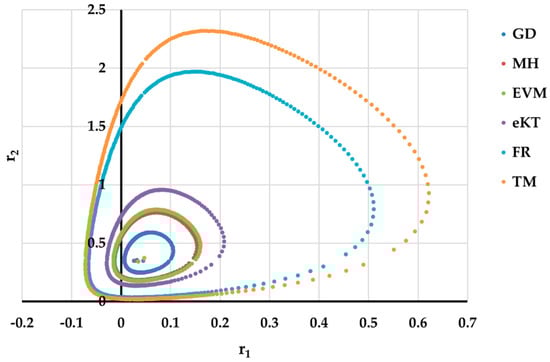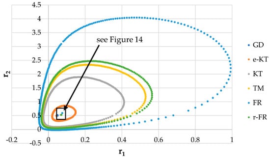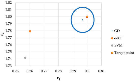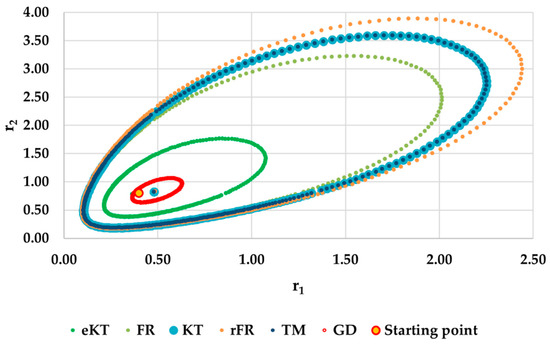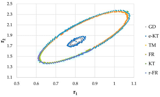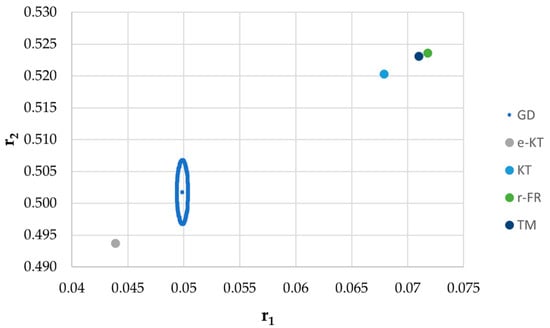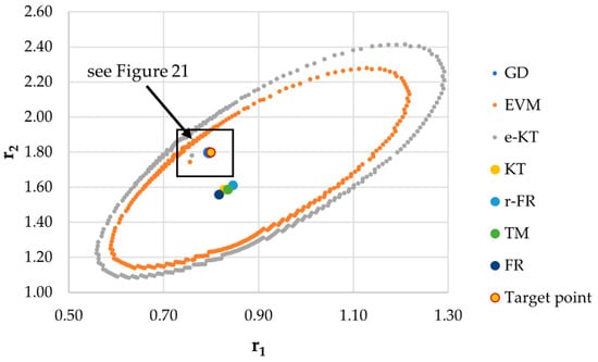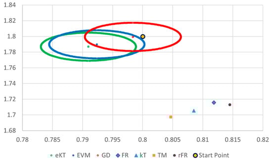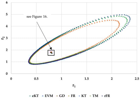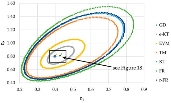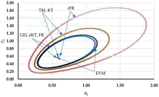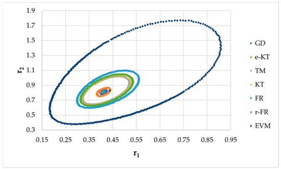 In the case of the conversion range between 10–25%, a good separation of the quality of the results between the differential and the integral methods can be made. This is observable both by the value of criterion Fc and by the size of the JCR domain shown in Figure 13, Figure 14, Figure 15, Figure 16, Figure 17 and Figure 18. It should be noted that among the integral calculation methods for r1 = 0.8 and r2 = 1.8, although they have a close value of criterion Fc and the confidence domains are small, GD is the only method that admits the target value within its JCR domain. Additionally, it should be noted that the reactivity ratios obtained by the methods presented are outside the JCR of the GD method. It is obvious that at high conversions over 30%, differential methods give erroneous values and large areas of JCR. In this case, there is a good separation of the quality of the results obtained between the GD and e-KT method. Surprisingly, the EVM method analyzed here, although an integral method, does not give acceptable results.