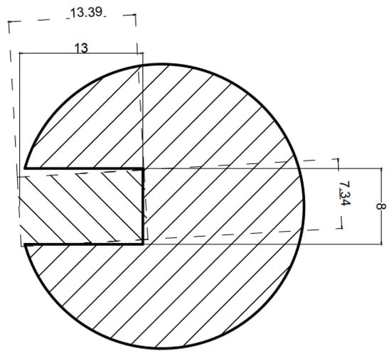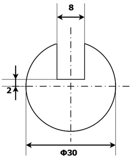 For this research, cylindrical samples with a reference defect were prepared. The samples were made of S235JR steel, (Łukasiewicz Research Network—Industrial Research Institute for Automation and Measurements PIAP, Warsaw, Poland) which is one of the most used materials for welded constructions, load-bearing structures, and dynamically loaded structures. The samples were in the form of a cylinder with a 30 mm diameter and a 120 mm height. The defect was a rectangular indentation with a constant depth of 13 mm and varying widths of 2, 4, 6, 8, 10, and 12 mm. The cross-section of the exemplary sample with an 8 mm wide defect is presented in Figure 1.