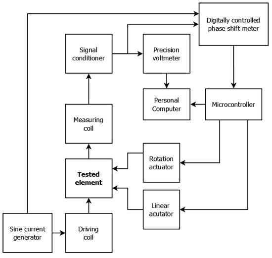 The sample was transferred between two air–core co-axial coils (driving and measuring). The measuring coil had a 6.1 mm internal radius and a 14.8 mm external radius, whereas the excitation coil had a 7.4 mm internal radius and a 17.9 mm external radius. Both coils consisted of 100 turns. An alternating current of 2 kHz powered the driving coil, which induced an alternating magnetic field that caused the induction of eddy currents in the conducting sample. The shape of the eddy current loop strongly depends on the distribution of electromagnetic parameters in the sample’s material, as well as on the object’s geometry, and is very sensitive to any discontinuities. The magnetic field of the measuring coil is a superposition of the initial magnetic field and the magnetic field induced by eddy current. The changes caused by the presence of the sample concern both the amplitude of the measured field and the phase shift between the excitation signal and the measured signal. The phase shift was measured by a digital phase shift meter, and the amplitude signal was measured by a 6½-digit AC voltmeter (TH1961, Tonghui, China). The entire measurement process was controlled by software developed in LabVIEW (National Instruments, Austin, TX, USA).