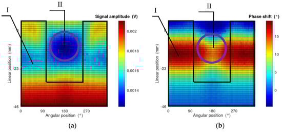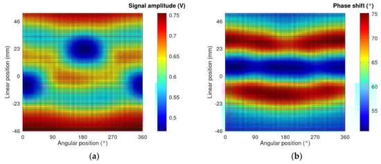 As a result of the measurement in the eddy current tomography setup, matrices representing the measurement signal amplitude and phase shift for each linear and angular position were obtained. Exemplary measurement results are presented in Figure 3. The values on the x-axis are angular positions of the sample, which are set by the rotation actuator. The values on the y-axis are changes in the linear position with respect to the center of the eddy current tomography setup.