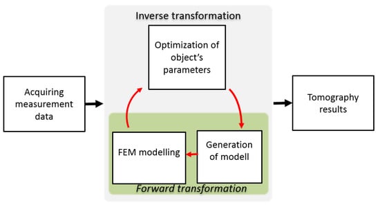 A diagram of the utilized method for inverse tomography transformation is presented in Figure 4 [20]. Inverse transformation processes are as follows. Initially, the measurement data are acquired. These data are compared with the results of FEM-based forward tomography transformation for the initial model, and the value of the objective function is calculated by (1).