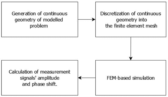FEM-based forward tomography transformation requires full FEM modeling to be conducted for each of the selected measurement points. This requires all operations listed in the scheme presented in Figure 5: the generation of the continuous geometry of the problem, discretization of this geometry to a finite element mesh, FEM calculations, and data acquisition and aggregation. The whole procedure can be conducted on a single processor core. Additionally, simulations in different linear and angular positions are independent of each other, which allows for parallel computations. This significantly improves the computational cost of forward tomography transformation and, thus, inverse tomography transformation. The whole procedure is automated, executed, and controlled by scripts developed in the Octave programming environment.