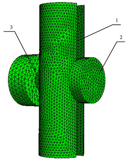 Exemplary finite element mesh for FEM-based forward tomography transformation in eddy current tomography. 1—model of the tested object, 2—model of the measuring coil, 3—model of the excitation coil.