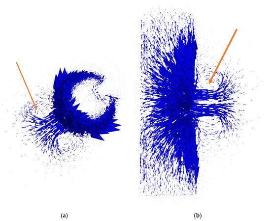 Exemplary spatial distribution of vectors of magnetic flux density in the tomography setup: (a) top view of the tested element; (b) side view. The arrow in each figure indicates the area of the excitation coil. All simulations were conducted in Elmer software. The length of an arrow represents the relative magnetic flux density in each node. The scale for absolute values is negligible, as all final results of tomography transformation are normalized to the 0–1 range.