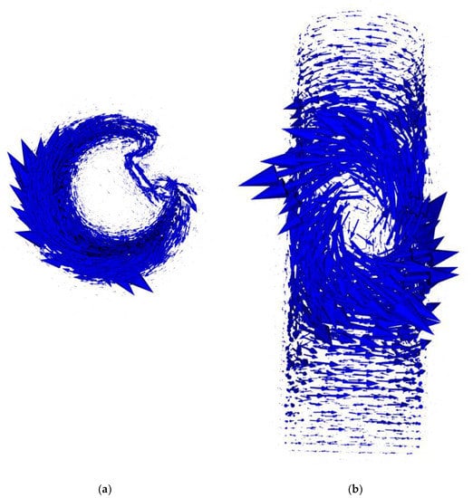 Exemplary distribution of vectors of induced eddy currents in the tomography setup: (a) top view of the tested element; (b) side view. All simulations were conducted in Elmer software. The length of the arrow represents the relative value of the induced current in each node. The scale for absolute values is negligible, as all final results of tomography transformation are normalized to the 0–1 range.