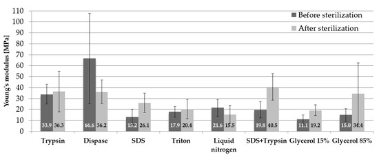 The obtained results of Young’s modulus mean values along with standard deviations (SD) in relation to the samples before and after sterilization are presented in Figure 5. In terms of the samples before sterilization, the use of dispase favourable affected mechanical properties. The tested samples were characterised by the highest values of the mean modulus of elasticity 66.6 ± 40.9 MPa. Cryopreservation in 15% glycerol was responsible for the fact that the tested specimens obtained the lowest values of Young’s modulus 11.1 ± 3.9 MPa.
