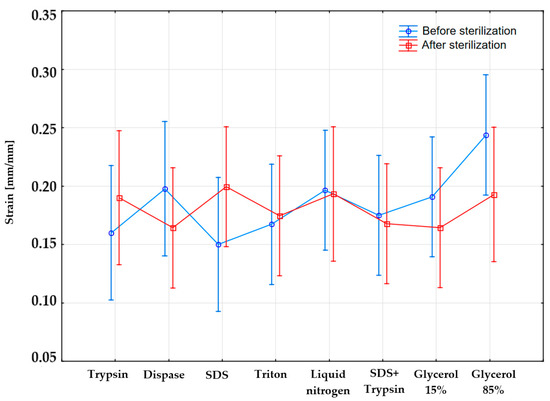The obtained strain mean values with standard deviations (SD) for the samples before and after sterilization are juxtaposed in Figure 4. The highest mean strain for the samples before sterilization occurs for the samples subjected to incubation in 85% glycerol 0.24 ± 0.11 mm/mm, whereas the lowest strain value occurred in the case of applied SDS 0.15 ± 0.05 mm/mm. The values of the mean strain in the case of samples subjected to sterilization are similar for three substances: trypsin, liquid nitrogen, and 85% glycerol amounting to 0.19 mm/mm. The highest mean strain value was observed in the case of SDS 0.20 ± 0.05 mm/mm, whereas the lowest was in the case of dispase and 15% glycerol 0.16 ± 0.02 mm/mm. The application of the sterilization process influences the decrease in mean strain values for dispase by 0.04 mm/mm, liquid nitrogen by 0.01 mm/mm, SDS and trypsin by 0.01 mm/mm, 15% glycerol by 0.03 mm/mm, and 85% glycerol by 0.05 mm/mm.