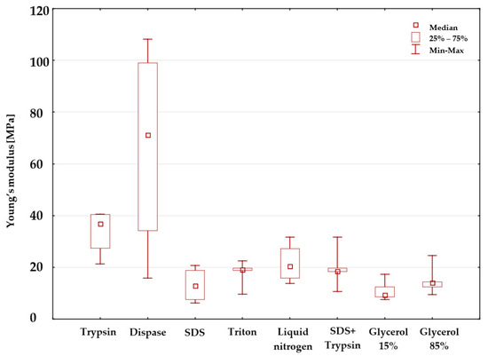 Figure 9 presents the graphic interpretation of the results. The analysis of the diagram reveals significantly higher values of the mean Young’s modulus in relation to substances, i.e., dispase (approximately 70 MPa) and trypsin (approximately 38 MPa) in comparison with the remaining reagents (approximately 15 MPa). The lowest value was obtained for 15% glycerol. The diagram confirms the results of repeated (multiple) comparisons, i.e., statistically significant differences between dispase and 15% glycerol, as well as trypsin and 15% glycerol.