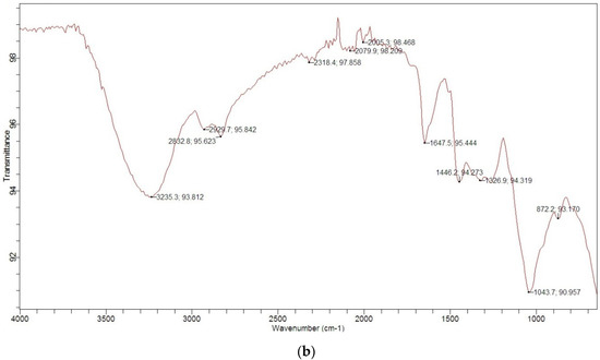 FTIR spectra of GS and MGS were recorded to investigate the presence of surface functional groups (Figure 2). The FTIR spectra of GS showed the presence of -OH groups at 3280 cm−1, where the very broad bands can be attributed to the OH stretching vibrations, probably due to inter- and intramolecular hydrogen bonding of the polymers (lignin and cellulose). The peaks at 2922 cm−1 and 2855 cm−1 could be attributed to the C-H stretching vibrations of -CH2 and CH3 groups. After modification of GS, the vibrational frequency of -CH2 groups was shifted to 2832 cm−1. The band at 1446 cm−1 in MGS is associated with quaternary ammonium groups [21]. A broad band at 1043 cm−1 corresponds to the vibration of quaternary ammonium salt [22]. The occurrence of the peak at 872 cm−1 in MGS can be attributed to glycoside bonds deformed by vibration and OH bending [23]. Similar results were obtained for quaternary amino anion exchangers from wheat residues [24] and giant reed used for phosphate removal [15].