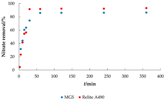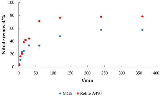The percent removal of nitrate from the synthetic wastewater after 360 min was 57.53% for MGS and 78.37% for Relite A490 (compared to Figure 3, the removal efficiency from the model nitrate solution was 86.5% for MGS and 93.3% for Relite A490). The decrease in removal efficiency from the synthetic wastewater was expected and can probably be attributed to the competing ions present. In particular, sulfate occupies most of the binding sites on adsorbent/anion exchange resins at concentrations commonly present in many water supply sources, which may further reduce the volume of an influent that can be treated before regeneration of adsorbent/anion exchange resins is required [32]. Banu and Meenakshi [33] reported that the sorption capacities of quaternized melamine-formaldehyde (MFQ) resin for nitrate were changed by Cl− and much more by SO42−. The SO42− ion has a higher anionic charge than nitrate, i.e., a multivalent anion with greater charge density was adsorbed faster than a monovalent anion.