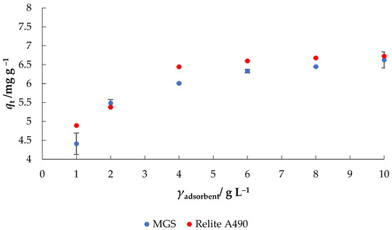 The effect of adsorbent concentration on the adsorption of nitrate to MGS and Relite A490 (γ0 = 30 mg L−1, t = 120 min, pH = 6.3, T = 25 °C, v = 130 rpm).