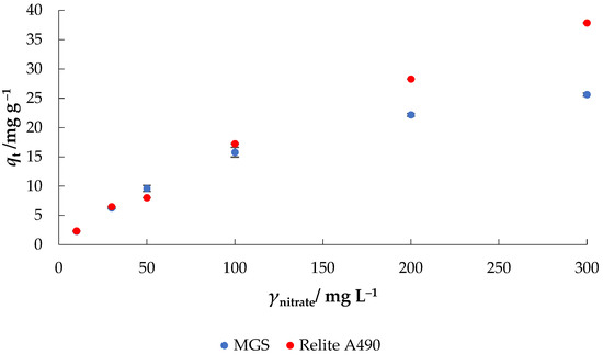 The effect of initial nitrate concentration on the adsorption of nitrate to MGS and Relite A490 (γ0 = 10–300 mg L−1, γadsorbent = 4 g L−1, t = 120 min, pH = 6.3, T = 25 °C, v = 130 rpm).