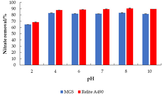 One of the major factors in the adsorption of nitrate from water is the pH of the solution. The pH of a solution controls the electrostatic interactions between the adsorbate and the adsorbent [10]. Figure 6 shows the effect of initial pH on adsorptive nitrate removal from a model nitrate solution using MGS and Relite A490. In the pH range of 4 to 10, the maximum percent nitrate removal was achieved. At pH 2, lower nitrate removal was observed, which can be explained by the competition of chloride ions with nitrate for adsorption sites (Cl- forms HCl solution at pH adjustment) [29]. In the work of Sowmya and Meenakshi [30], nitrate removal was studied over the pH range of 3 to 9 using quaternized chitosan beads. Again, the percentage nitrate removal was lower at pH 2. Shojaipour et al. [31] studied nitrate removal with functionalized hydrogel bioadsorbents (GT) over a broad pH range (3–10), and revealed best nitrate adsorption at neutral pH, and low nitrate removal at acidic pH due to hydration of the hydroxyl group of the GT.