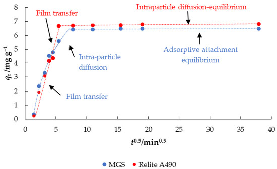 According to Weber [39], the first step here is film transport (film diffusion), in which the adsorbate is transported from the liquid bulk to the outer surface of the adsorbent, the second step is intraparticle diffusion, in which the adsorbate diffuses from the outside of the adsorbent into the pores, and the third step the adsorptive attachment equilibrium phase, in which the adsorbate binds to the active sites of the adsorbent for MGS, while both film transport and intraparticle diffusion equilibrium can be observed for Relite A490. The intraparticle diffusion rate model of Weber and Morris [40] is presented below:
