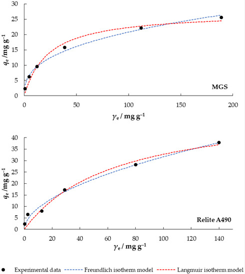 Adsorption isotherms provide information about the distribution between liquid and solid phases in equilibrium and give insight into the maximum adsorption capacity of an adsorbent for adsorbate [41]. For this purpose, the Langmuir and Freundlich adsorption isotherms are usually used. Figure 9, therefore, shows the adsorption isotherms for nitrate on MGS and Relite A490.