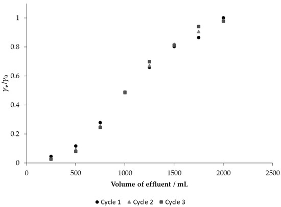 The applicability of MGS on nitrate removal was investigated in fixed bed column experiments. The breakthrough curves obtained are shown in Figure 10. One of the desirable characteristics of a good adsorbent is to be reusable over several adsorption/desorption cycles after regeneration [44], so three adsorption and desorption cycles were performed in this study using MGS as adsorbent.