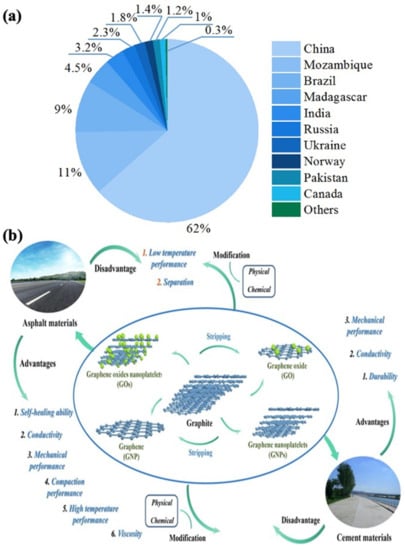 (a) Countries as major producers of graphite; (b) main applications of graphite-based materials in civil engineering (reprinted from [] ©2021 with permission from Elsevier).