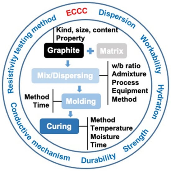 To date, although several important reviews have discussed ECCCs [,], most have focused on multi-element conductive fillers rather than specifically targeting graphite-based ECCCs. Our focus here is on the properties of the cementitious composites mixed with graphite in fresh and hardened states. As shown in Figure 3, this review covers the dispersion, workability, cement hydration, mechanical strength, durability, and electrical conductivity of traditional cementitious materials modified with graphite. Various modify graphite composite modification methods and testing methods for the electrical conductivity of ECCCs are also summarized.