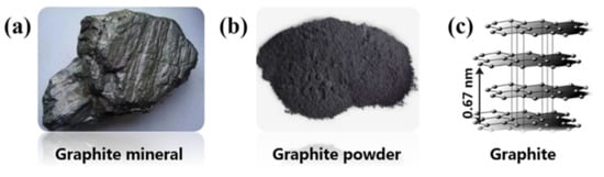 Graphite can be divided into two categories: natural and artificial. Natural graphite is a mineral as shown in Figure 4a, which is found in metamorphic rocks and igneous rocks with extremely soft sheets and very low specific gravity []. Artificial graphite affords various properties of the material due to the different types of precursors and formation processes []. The most common form of graphite currently utilized is flake graphite, which is suitable for many practical applications and has the highest market share in the world among the various forms of graphite available []. Photographs of the crystalline structure of flake graphite powder are shown in Figure 4b,c. The fundamental structure of graphite is composed of a series of stacked parallel layers (i.e., graphene layers), which are comprised of carbon atoms bonded by strong covalent bonds. Weak bonds (Van der Waals) also exist among each layer. The d-spacing of the C6 ring is 0.335 nm [,,].