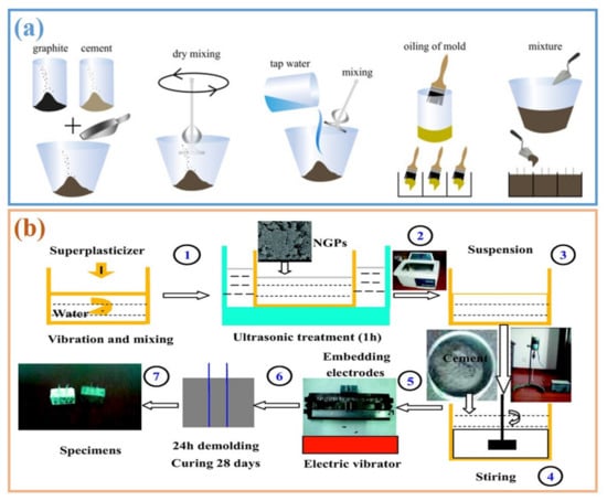 Preparation of graphite filled cementitious composites. Dispersion methods of (a) mixing compounds in dry powder form (reprinted (adapted) from [] which is an open access article and permits unrestricted use); (b) adding powders into solution to prepare uniform suspensions (reprinted (adapted) with permission from [] ©2017 with permission from Elsevier).
