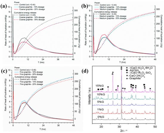 Effect of graphite size and concentration on cement paste hydration: (a) coarse, (b) medium, and (c) fine graphite (reprinted (adapted) from [] which is an open access article and permits unrestricted use); (d) XRD patterns of graphite-aluminate cement composite paste (reprinted (adapted) with permission from [] ©2012 with permission from Elsevier).