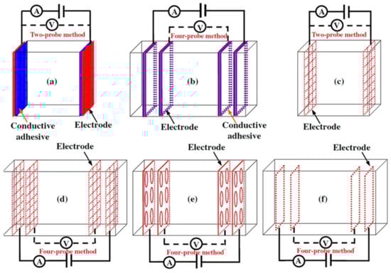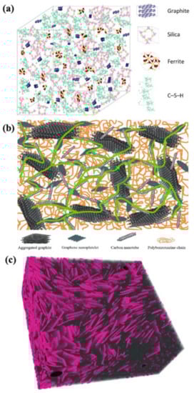 Cement is a dielectric material which functions as an ionic conductor due to its water content []. Electronic conduction can also be engineered by adding electrically conductive fillers to cement-based materials []. Various types of conductive fillers can reduce the electrical resistivity of cement-based materials so as to realize electrical conductivity. Carbon-based fillers have been widely investigated in recent decades. Cementitious composite materials with high electrical conductivity can be obtained by modification with conductive carbon fillers such as graphite power (GP) [], graphene [], carbon nanotubes (CNTs) [], carbon fibers (CFs) [], and carbon black (CB) [] to form conductive networks inside the cementitious matrix [].