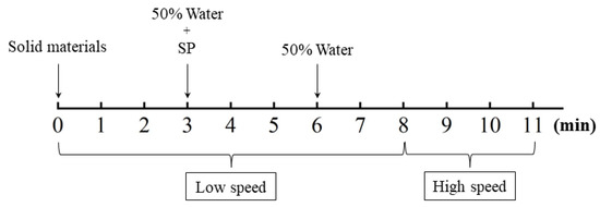 A JJ-5 mixer was used to prepare the mixture, of which the low speed and high speed were 140 ± 5 rpm and 285 ± 5 rpm, respectively. Before mixing, two aggregates were dried at 105 °C for 24 h and then cooled to room temperature. During the cooling process, the container surface was covered to avoid the moisture. The mixing procedure for all of the UHPC mixtures is shown in Figure 5. First, all of the solid materials were added and mixed at a low speed of 140 ± 5 rpm to ensure uniform dispersion. Then approximately 50% of the water was added, followed by the remaining 50% of the water with SP; the resulting mixture was then further mixed at low speed. Finally, all materials were mixed at high speed of 285 ± 5 rpm for another 2 min. After mixing, the fresh materials were cast into molds. Two types of molds with different dimensions were used: 50 mm × 50 mm × 50 mm mold for compressive test [33] based on Standard ASTM C109/C109M-20b and 25 mm × 25 mm × 280 mm mold for autogenous shrinkage test, respectively.