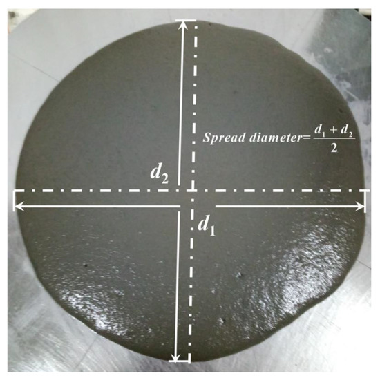 Workability is an important property of fresh UHPC which significantly influence its mechanical and other properties. After the mixing process, the workability of UHPC was tested firstly, the fresh mixture was poured into a steel cone lying on a flat plate. The cone was lifted vertically while ensuring that the mixture flowed freely. The diameters of the two vertical directions of the mixture were then measured, and the mean of the measurements was used as the workability of the UHPC mixture, as shown in Figure 6.