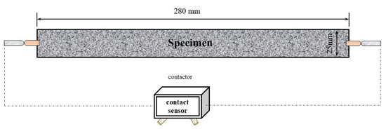 A test was carried out to measure the effect of TS content on the autogenous shrinkage of UHPC. After mixing procedure, the slurry was poured into the mold with a size of 25 mm × 25 mm × 280 mm based on ASTM C490-17 [35], and two contactors were embedded at both ends of the specimen simultaneously (Figure 7). After one day under a temperature of 20 ± 2 °C and a relative humidity of 60 ± 5%, the specimen was demolded. Then a contact sensor was used to measure the length and autogenous shrinkage of specimens every 15min, until reach the 7 days. The whole testing procedure is also under a temperature of 20 ± 2 °C and a relative humidity of 60 ± 5% [36].